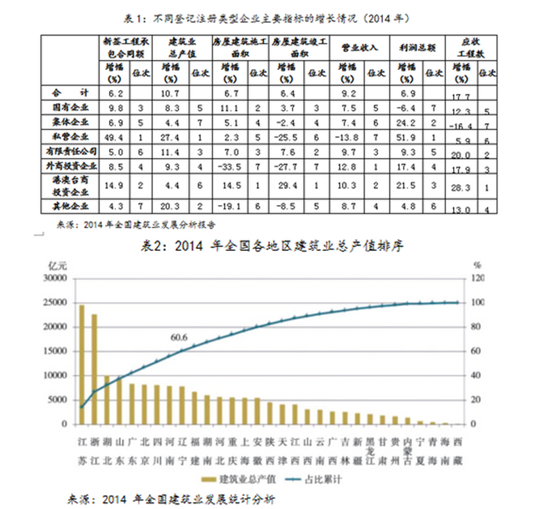 目前,全國大部分建筑業企業為民營,江蘇、浙江、廣東等東部省份95% 以上是民營企業。民營建企的產值規模從開始的幾百萬元增長到數十億元,不少企業超過100億元,甚至超400 億元。建筑業發達省份民營建企的施工產值50% 以上是在省外市場完成的,許多省份外來注冊施工企業超過千家,中西部地區有的省份外來施工企業數量超過本省施工企業數量。大部分實力較強的企業還把市場延伸到了世界各地。目前,江蘇民營建企已經覆蓋到了全球120 多個國家和地區,營業額以年均20% 左右的速度增長,呈現出多元化、多專業的良好發展態勢。 2014 年,江蘇省2.7 萬億建筑業總產值的90% 以上為民營企業所完成。